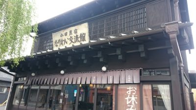 地域再生マネージャー事業「ふるさと再生事業」で、福島県柳津町を訪問しました。写真は、道の駅にある「奥会津ビジターセンター 清柳苑」です。 伝統的な木造建築で、赤べこのオブジェが観光客を迎える観光・物産施設です。(7月28日~29日 地域再生部)