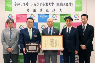 青森県三沢市にて、令和7年度ふるさと企業大賞(総務大臣賞)を受賞したスターゼンミートプロセッサー株式会社(推薦自治体:三沢市)への表彰状伝達式が行われました。 同社は、ふるさと融資を活用した食肉加工工場等増改築事業を通じて、地域雇用及び地域小中学校の食育活動に貢献しました。(地域産業課)