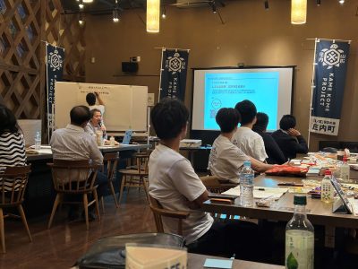 地域再生マネージャー事業「ふるさと再生事業」で、兵庫県豊岡市を訪問しました。写真は、若者たちが20枚のスライド×20秒で自分たちの想いをプレゼンするイベント「ぺちゃくちゃナイト」の様子(6月7日~8日 地域再生部)