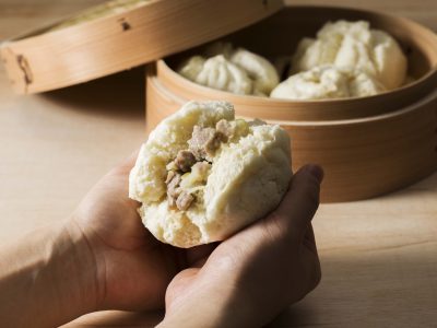 ものづくり支援事業の視察のため、北海道積丹町を訪問しました。写真は、積丹町で生産した羊肉を使用した肉まんの写真です。(地域産業課)