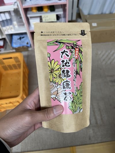 ものづくり支援事業の視察のため、青森県中泊町を訪問しました。写真は、地域特産品を原料として開発された健康茶の写真です。株式会社竹内組様と弘前大学の共同研究と中泊町との連携によって開発されました。(地域産業課)